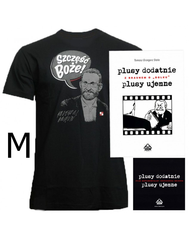 PAKIET: Koszulka męska Grzegorz Braun - Szczęść Boże! T-shirt Rozm. M + Plusy dodatnie, plusy ujemne + Z Braunem o Bolku - film DVD z książeczką.