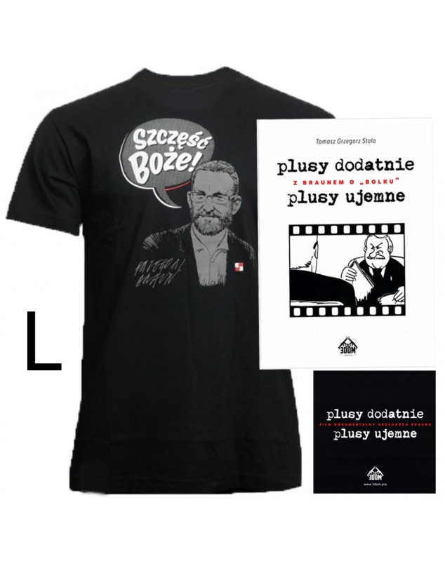PAKIET: Koszulka męska Grzegorz Braun - Szczęść Boże! T-shirt Rozm. L + Plusy dodatnie, plusy ujemne + Z Braunem o Bolku - film DVD z książeczką.